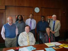 Some of the people behind Books 4 Buddies: Front row seated: L to R, Clyde Scoles, and Laneta Goings. Back row standing: L to R, Jim Funk, Eddie Allen,; Richard Jackson, Am-visor, Johnathon Bush, and Dr. Jerome Pecko,